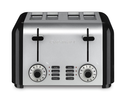 No breakfast is complete without a perfect piece of toast and the Cuisinart 4 Slice Brushed Stainless Hybrid Toaster toasts your bread to perfection every time. This sleek and modern stainless steel and black toaster will be a great compliment to your stainless steel kitchen appliances. It has all the features you are looking for: 4 slots that can toast 2 pieces of toast and 2 bagels at once, dual controls, defrost and reheat settings, a slide-out crumb tray, automatic shut-off and a cancel option.