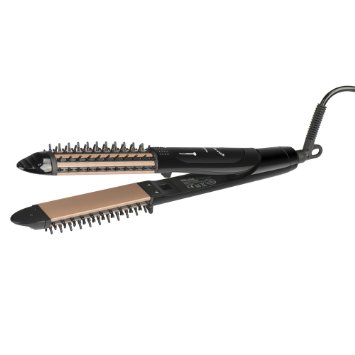 The unique barrel of the ConiStraight is rounded, tapered, and split, making it one of the most versatile irons in professional styling. Opened up as a flat iron, titanium plates glide over hair to straighten, shine and smooth. Bending the ends of hair around the curved outer barrel creates flips and curves; wrapping hair between twin barrels forms twisted drop curls and beautiful loops. Locked into the closed position, the styler becomes a tapered curling iron that creates any size curl or wave. Tiny silicone guides on the clipless titanium barrel guide hair into the perfect position for spiral curls, and cool tips offer great maneuverability.
